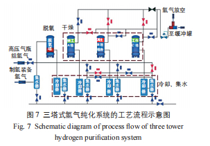 三塔式氢气纯化系统的工艺流程为:首先进行脱氧,在脱氧塔中,氢气中的少量氧气在催化剂的作用下可与氢气发生反应生成水;脱除杂质后,经过冷却器和集水器,冷却分离除去游离的小水滴,然后氢气进入分子筛吸附干燥器再次去湿;最后通过压力调节阀调定纯化工作压力,并通过高效过滤器除尘,最终获得高纯氢,其示意图如图7 所示。