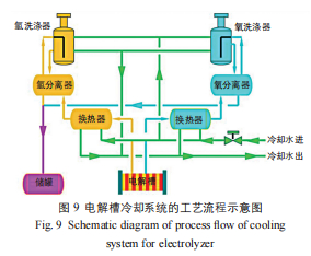 除了上述基本工艺流程外,海上风电制氢系统中冷却过程同样必不可少。虽然电解水制氢过程是吸热反应,但在制氢过程中需要源源不断地给其提供电能,而供给的电能通常比电解反应需要的能量要多,因此多余的能量会转化为热量。而当电解槽在规定的温度范围以下工作时,该部分热量可用于加热碱液,以提高电解槽的工作温度;当电解槽在规定的温度范围内工作时,多余的热量需由冷却水带走,以维持正常的反应温度。除此之外,电解水生成的氢气、氧气也必须冷却除湿;同时,风电电力输出端与制氢设备之间的整流装置及大型设备的泵机也需要设置必要的冷却管路。电解槽冷却系统的工艺流程示意图如图9 所示。