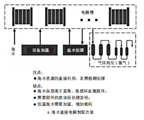 电解海水制氢工艺主要包括直接海水电解制氢和海水淡化后电解制氢2 种方案,其示意图及优缺点如图2 所示。对两种方案的优缺点进行对比分析: