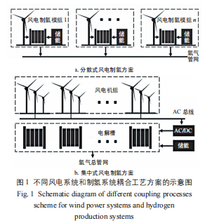 2) 集中式风电制氢方案,即多台风电机组耦合多个电解槽构成风电制氢模组的功能化合并式制氢方案。此方案的优点是功能化明确,后期维护成本低,无需考虑多台风电机组的能量差异,且可以使用已有的海上风力发电平台。不同风电系统和制氢系统耦合工艺方案的示意图如图1 所示。
