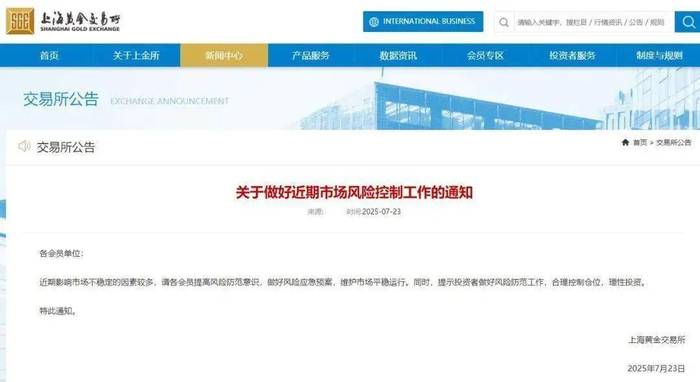 记者注意到,就在金价冲高之际,上海黄金交易所23日发布公告称,近期影响市场不稳定的因素较多,请各会员提高风险防范意识,做好风险应急预案,维护市场平稳运行。同时,提示投资者做好风险防范工作,合理控制仓位,理性投资。在此之前,上海黄金交易所已经在今年连续6次明确发布风险提示或加强风险防控的通知。