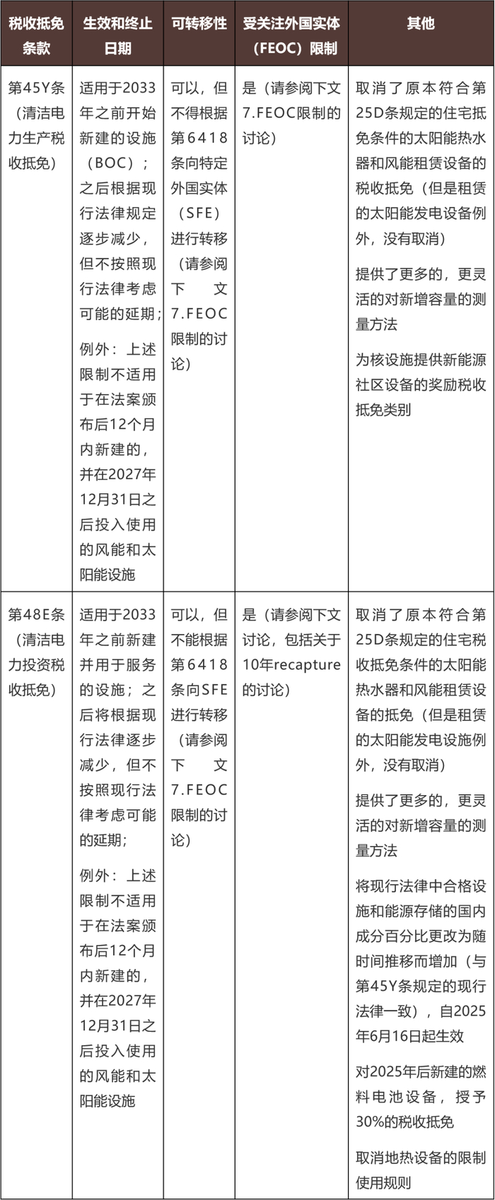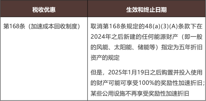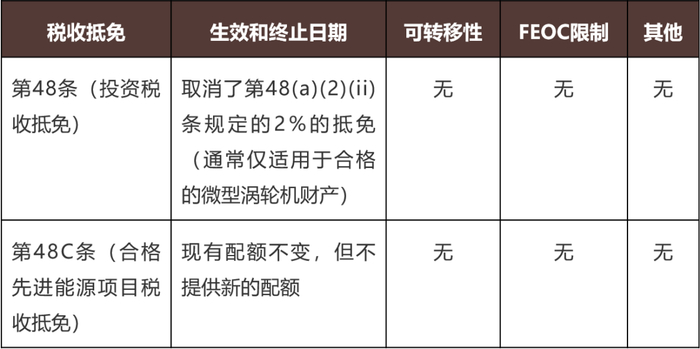 终止第45Y和48E条款下的风能和太阳能设施的清洁电力生产和投资的抵免。对于在新法律生效后12个月后开始建设、且在2027年12月31日之后投入运营的项目,不再适用相关抵免。