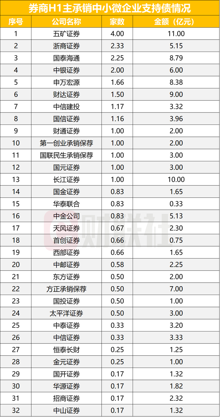2025年上半年作为中小微企业支持债券主承销商的证券公司共32家,承销30只债券,合计金额118.2亿元。