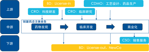 提供CXO服务的企业,具体来说,主要包括CRO(合同研发组织)、CDMO(合同研发生产组织)和CSO(合同销售组织)等。从图1可见,CXO业务贯穿创新药主体业务的全流程,涵盖药物的研发设计、生产到最后的流通销售环节。