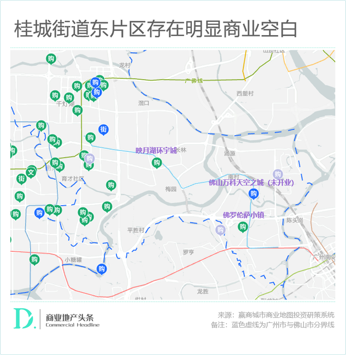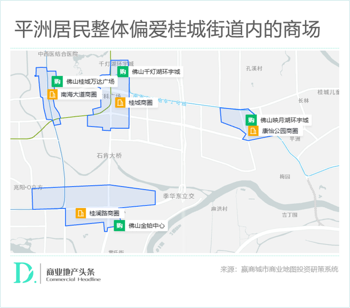 放到地图上看,整个佛山桂城街道东片区(以平洲+三山为主),只有映月湖环宇城一个购物中心和广佛佛罗伦萨小镇一个奥莱项目,存在明显的商业空白。
