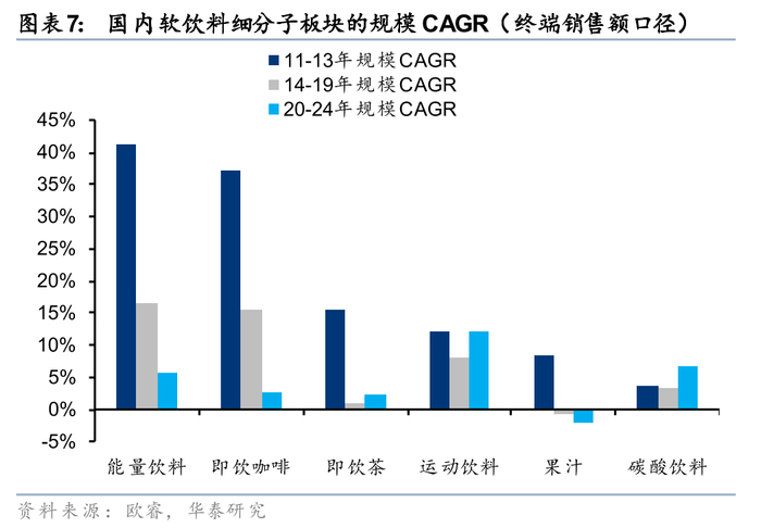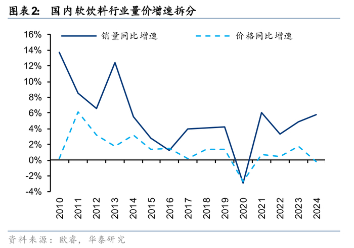 软饮料赛道空间广阔,为孕育大单品的沃土。据欧睿,24年国内软饮料市场规模达6914亿元,对应14-24年CAGR为4.0%,其中24年瓶装水行业市场规模2470亿元,14-24年CAGR为6.8%;24年碳酸行业市场规模1288亿元,14-24年CAGR为5.2%;24年能量饮料行业市场规模621亿元,14-24年CAGR为10.2%;24年即饮茶行业市场规模1364亿元,14-24年CAGR为0.9%;24年果汁行业市场规模777亿元,14-24年CAGR为-1.7%。销量看,24年国内软饮料销量达1090亿升,对应14-24年CAGR为3.3%,千亿级别赛道长坡厚雪,广阔的行业空间构成大单品孕育的沃土。
