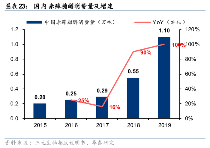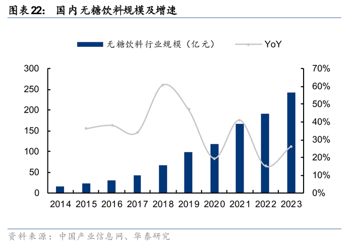 国内无糖饮料始于1997年,爆发元年在2018年,疫情后公众健康意识崛起,亦加速了无糖饮料的发展。国内第一款无糖茶饮是1997年三得利引入中国的无糖乌龙茶。此后很长一段时间内,统一、可口可乐、农夫山泉等相继推出无糖茶,典型代表如2011年农夫山泉推出的东方树叶。但考虑到当时软饮料仍在量增主导的产品普及阶段,消费者对饮料口感(甜味)的要求较高,而对更高阶的健康化需求并不强烈,东方树叶为代表的无糖产品无法满足消费者对软饮料口味的要求,因此反响平平。国内无糖茶饮真正的爆发始于2018年,以元气森林推出燃茶及气泡水大单品为标志,首次在实现无糖的同时保障了产品口感,因而备受消费者青睐,从终端销售额来看,2018年国内无糖茶饮/无糖碳酸饮料/其他无糖饮料市场规模分别同比+36%/+91%/+75%至31.2/34.6/1.4亿元(据中国产业信息网),行业增速较以往年度大幅提升。原材料端看,赤藓糖醇为无糖化趋势下重要的代糖添加剂,2018/2019年国内赤藓糖醇消费量分别为0.55/1.10万吨,同比+90%/+100%,增速较以往年度大幅提升,同样验证了无糖化产品消费量的爆发。此外,疫情后公众健康意识崛起,此后各大饮料企业纷纷推出自己的无糖茶饮品牌,国内无糖饮料进入快速成长阶段,东方树叶近年来持续高增,从“最难喝的饮料”成功逆袭为无糖风暴的领航者。