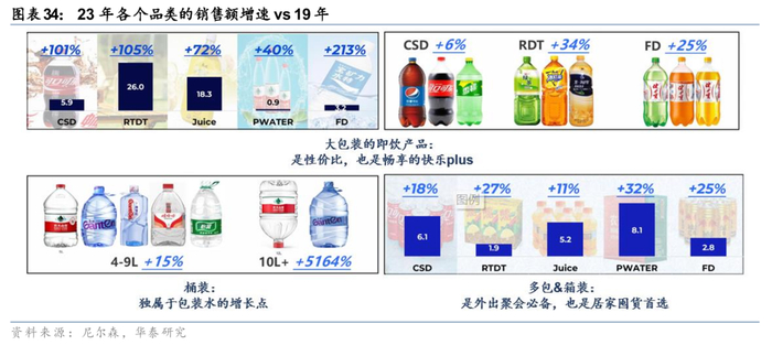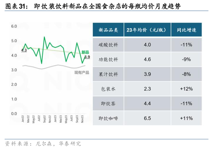 2) 产品价格:当前500ml产品普遍定价3-5元,1L产品普遍定价5-6元(部分产品设置了“1元乐享”等促销活动),除农夫在加大推广高定价的NFC果汁以外(统一也有少量高价的果汁新品),整体产品定价还是偏向于性价比的趋势,新品的价格通常高于现有产品,据尼尔森数据,从全国食杂店的新品定价来看,23年碳酸饮料均价4.0元/瓶(同比-11%),功能饮料均价4.6元/瓶(同比-9%),果汁饮料均价3.9元/瓶(同比-8%),即饮茶均价4.4元/瓶(同比-11%),包装水均价2.3元/瓶(同比+12%),主要受苏打水影响,即饮咖啡均价6.5元/瓶(同比+11%),受到新品品牌定位差异影响。