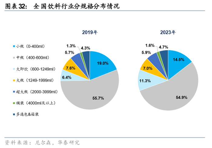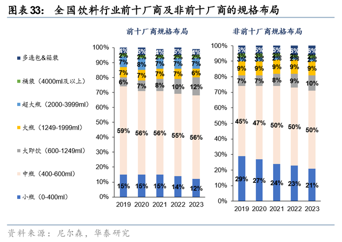3) 产品规格:据尼尔森数据,大包装产品为饮料行业提供了新的收入增长点,大厂拥有更为成熟的品牌力和供应链,进一步衍生出更细分的规格布局,是其顺应消费者碎片需求之下的顺理成章之举,全国饮料行业前十大厂商中,600ml及以上的大规格产品收入占比由19年的26%逐步提升至23年的31%。大包装产品的战略意义主要体现在三个方面:1)拓展消费场景,满足家庭饮用、户外活动等多人共享需求;2)延长产品生命周期,通过规格创新为成熟单品创造二次增长曲线。具体产品布局上,东方树叶于24年1月推出900ml规格的产品,25年进一步上市1.5L大包装产品;元气森林、东鹏、统一、怡宝等企业也相继在24-25年推出900ml-1L规格的无糖茶、运动饮料等产品,通过多SKU策略覆盖不同的消费场景(如家庭囤货、运动补给等),进一步强化大包装产品的市场渗透。
