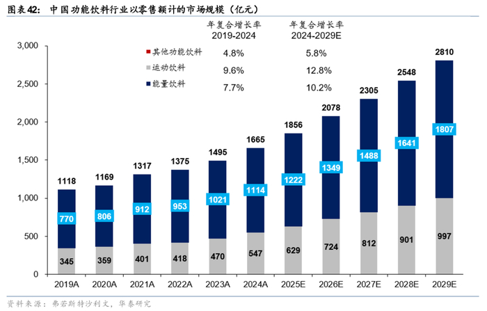 功能饮料赛道广阔、有望承载多款百亿单品。结合当前国内功能化饮料的发展现状,我们认为能量饮料赛道的发展更加成熟,而行业广阔的市场空间以及良好的增长潜力意味着行业具备容纳多款百亿大单品的潜力。欧睿数据显示,24年红牛中国市场终端零售额为234亿,为行业内第一款百亿大单品,东鹏饮料凭借差异化的产品及性价比优势实现与红牛的错位竞争,近年来表现出较强的增长潜力,至24年终端市场零售额达176亿。此外,运动饮料系中国功能饮料行业的另一增长极,根据弗若斯特沙利文,运动饮料是中国功能饮料行业中增长最快的细分品类,以零售额计,19-24年运动饮料市场规模从345亿元持续增长至547亿元,期间CAGR为9.6%,24年运动饮料占整体功能饮料市场零售额的32.8%,并预计将以12.8%的CAGR、于29年增长至997亿元,冲刺千亿规模,广阔的市场空间亦有望承载多款百亿单品。