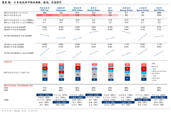 4)2004年至今:品类结构交织更迭,无糖化驱动“有糖碳酸”转向“无糖碳酸”、“有糖咖啡”转向“无糖咖啡”,功能化驱动保健功能饮料焕发新活力,包装水的便捷属性带动水行业的包装化率不断提升。2004年至今,日本软饮料行业依然呈现无糖化&功能化的趋势。一方面,碳酸饮料中无糖气泡水对于有糖碳酸饮料形成明显替代,咖啡消费者的主流选择亦从有糖咖啡切换至无糖咖啡;另一方面,特定保健用食品+机能性食品的政策逐步放宽,使得添加了膳食纤维、促进脂肪分解或调节肠道菌群的软饮新品层出不穷。此外,矿泉水市场规模在软饮料总规模中的占比也有所提升,虽然日本有直接饮用自来水的习惯,但瓶装水的便捷属性与户外、上班携带等场景更加适配,日本水行业包装化率逐步提升。