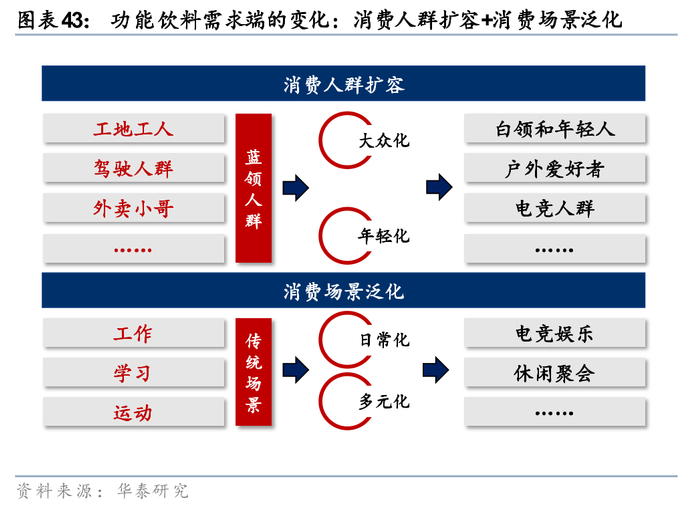 三、功能化下趋势下,能量饮料和运动饮料均有人群扩容和场景扩充的空间。饮料功能化的核心在于挖掘真需求,解决真困境,并据此强化消费粘性,延长产品生命周期。因此真正解决消费者痛点、具备明确功能价值的产品往往具备稳固的消费基础,销售规模增长的确定性同样更强。对标海外,我们认为目前国内饮料功能化属性的挖掘与产品开发尚处于相对初级的阶段,仍有较多功能化需求亟待挖掘。