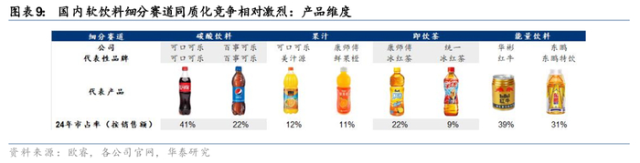 竞争维度的单一导致存量时代软饮料行业的竞争比想象中更加激烈。我们认为,产品端和渠道端的同质化导致软饮料行业竞争维度相对单一,进入存量竞争时代后百亿大单品的培育难度较高,具体看:1)产品维度:尽管软饮料行业存在碳酸饮料、果汁、茶饮、咖啡等众多细分赛道,但均为对甜味的不同形式呈现。不同于食品可以通过酸、甜、辣、咸等多元化口味的选择和组合实现差异化,主流软饮料在口味的呈现上基本仅能围绕甜味这一个维度进行差异化布局,导致产品同质化程度更高。2)渠道维度:不同于白酒具备礼赠、收藏、宴席、自饮等多元化的消费场景,软饮料最主流的消费需求为解渴,在渠道铺设上亦是围绕消费者的解渴需求展开,满足消费者就近购买、便捷性购买的诉求,因而在渠道铺设的目标与执行手段上同样具备较高的同质性。