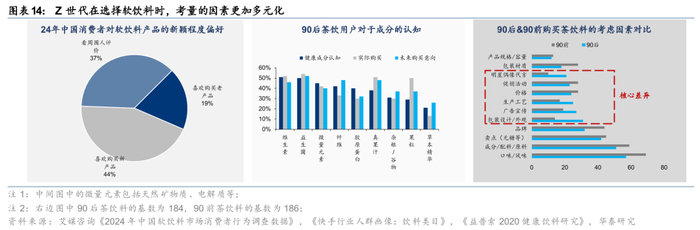 软饮赛道空间广阔,为孕育百亿单品的沃土,目前中国软饮赛道百亿单品(括号内为24年含税口径销售额)包括红牛(234亿)、东鹏特饮(176亿)、王老吉(138亿)、康师傅冰红茶(127亿)、雪碧(170亿)、可口可乐(150亿)、百事可乐(150亿)、AD钙奶(115亿)等。中国软饮料行业的百亿单品主要诞生于2014年前的行业增量期,而后随着行业增速放缓,同质化竞争下大单品培育难度骤增。新消费时代迎来新需求,有效延展竞争维度,从单一的口味评判延展至包装/营销/配方/性价比/功能属性等。