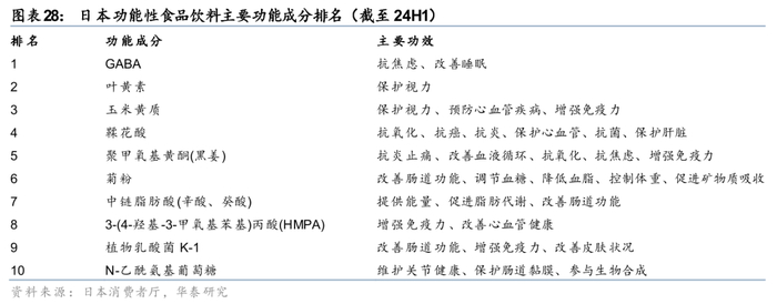 对标日本,国内功能性饮料产品仍有较大挖掘空间。对比海外,我们发现日本市场对泛功能性食品饮料的挖掘开发更加充分,体现在:1)对主流功能成分的挖掘相对充分,针对GABA、膳食纤维、茶氨酸、玻尿酸、DHA等功能性成分均有较多对应的功能性食品饮料产品;2)日本针对细分人群特殊功能性需求的开发同样充分,举例而言,日本森永曾针对花粉过敏人群推出具备缓解花粉过敏功效的益生菌饮料产品,伊藤园亦曾推出具备一定紫外线防护功能的蔬菜汁产品,敏锐的细分人群需求洞察能力及产品研发创新能力是日本功能性食品饮料产品保持繁荣的重要支撑。对比日本市场,我们认为当前国内市场对功能性食品饮料产品的开发挖掘尚处于初级阶段,仍有大量细分人群、细分需求有待挖掘,功能化或将成为国内饮料产品差异化竞争的重要助力。