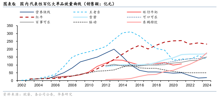 软饮赛道空间广阔,为孕育百亿单品的沃土,目前中国软饮赛道百亿单品(括号内为24年含税口径销售体量/诞生时间)包括红牛(234亿/1995年)、东鹏特饮(176亿/2009年)、王老吉(138亿/1830年)、康师傅冰红茶(127亿/1996年)、雪碧(170亿/1984年)、可口可乐(150亿/1978年)、百事可乐(150亿/1981年)、AD钙奶(115亿/1996年)、旺仔牛奶(21年体量106亿/1996年);曾经的百亿单品(括号内为巅峰时期含税口径销售额/巅峰时间)包括营养快线(~200亿/2013年)、脉动(~100亿/2015年)等。中国软饮料行业的百亿单品主要诞生于2014年前的行业增量红利期,而后随着行业增速放缓(14-24年国内软饮销售额CAGR为3.3%),激烈的同质化竞争下大单品培育难度骤增。