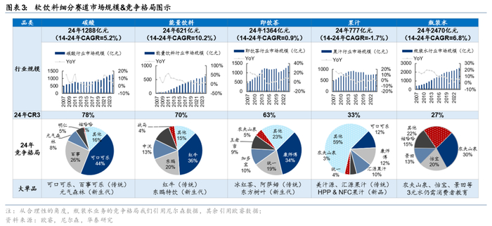 进入存量竞争时代,产品打造&渠道运营的重要性凸显。软饮料行业的竞争本质上是产品力、品牌力与渠道力的综合较量,其中产品创新是突破同质化竞争的关键。新兴企业通过打造新品类(如元气森林无糖气泡水)可开辟差异化赛道,以高周转、高溢价能力打开市场空间。但产品创新仅是起点,渠道建设(如经销商网络深耕)亦为实现规模化的核心壁垒。当前软饮料行业已进入结构性增长阶段,在本节中,我们重点探讨哪些细分景气赛道有望乘势而起、哪些新产品有望实现突破,并结合多维竞争要素研判中长期的行业格局演变趋势。