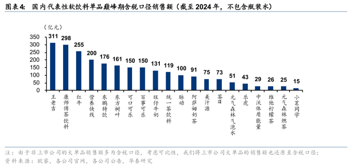 茶饮料:规模领先的软饮细分赛道,长坡厚雪孕育出王老吉、冰红茶等大单品。茶饮料2023年起销售体量超越碳酸品类、成为国内软饮料(不含瓶装水)中销售规模最大的细分赛道,2024年茶饮行业销售额1364.4亿元(据欧睿),占软饮料整体(不含瓶装水)的比重为19.7%,茶饮料作为中国饮料行业的基石性赛道孕育了大量单品。1)王老吉:王老吉凉茶凭借精准的产品定位(清热降火)快速脱颖而出,巅峰期(2015年)含税口径销售额达311亿,2024年销售额138亿元(据欧睿)。2)以康师傅冰红茶/统一绿茶为代表的康师傅&统一茶饮料:依托两家公司强大的渠道力、突出的性价比、强势的营销支持(如再来一瓶等促销活动)持续多年稳居茶饮领导品牌,2024年两家公司的茶饮料业务含税口径销售额均在百亿以上。