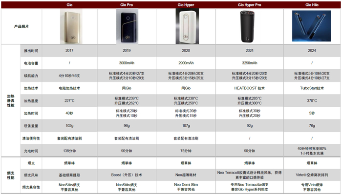 Glo Hilo技术迭代升级,新品竞争力全球领先。英美烟草加热不燃烧品牌为Glo,最初于2018年自雷诺烟草收购获得,后续围绕加热温度、烟支口味、电池续航、使用便利等维度迭代优化。2024年10月,英美烟草发布首个加热不燃烧高端加热平台Glo Hilo,在加热技术及用户体验上较此前产品实现突破,2024年底产品于塞尔维亚试销,2025年6月正式进入日本宫城县,为英美烟草当前主力产品。