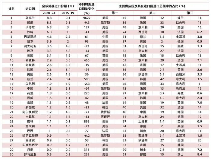 表2:全球前三十大主要武器进口国及其主要供应国(2020-2024)