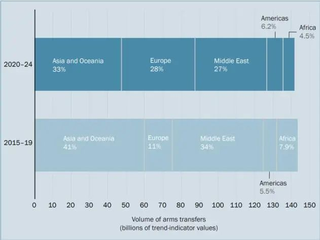 图15:2020-24和2015-19年不同地区武器进口份额