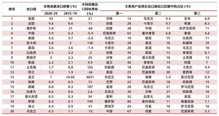 表4:全球前二十大主要武器出口国及其主要客户(2020-2024)