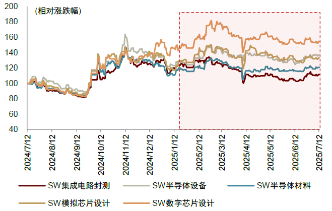 半导体设计板块:我们再次强调,AI相关应用依然是驱动设计板块成长的主要源动力。展望2H25,我们看好整个国内的“算力-模型-应用-数据”的飞轮正循环正在形成,为国产云端算力芯片带来持续的需求拉动;在AI赋能下,新终端发展也为SoC芯片带来持续的投资机会。另一方面,尽管传统终端需求复苏依然处于较温和的状态,我们看到利基型存储市场格局变化、CIS产品向车载/新应用渗透、工业/车规级高端模拟芯片突破、SiC/GaN三代半导体国产化等结构性变化,同样可以为优秀的半导体设计企业带来业绩稳定增长。