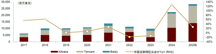 图表7:2017-2025E国内头部CSP厂商资本开支及增速情况