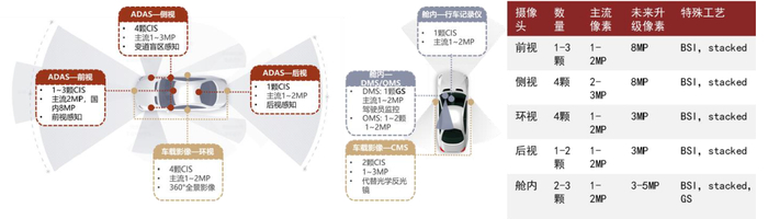 1)“智驾平权”趋势下车载CIS量价齐升。我们观察到国内外车企车载摄像头正在积极部署,产业链供应紧俏。我们预计不远的将来,在比亚迪为代表的车企引领推动下,50%的车型将搭载10颗以上的摄像头以支持NOA,我们预计8MP的占比将显著提升带来CIS芯片价值量上升。根据Yole数据,2023年豪威集团、安森美、索尼为全球领先的汽车CIS供应商,思特威在环视领域开始崭露头角(汽车CIS全球市占率约为3%)。