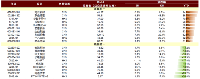 图表6:A/H股半导体及元器件公司股价涨跌幅前十(YTD)