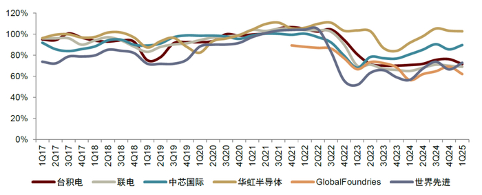 展望2H25:1Q25中芯国际、华虹半导体稼动率分别为90%、103%,处于旺盛状态,而海外二线大厂稼动率大致在60%~70%区间,背后反映的是“China for China”趋势下,全球成熟制程新增需求基本均被中国大陆晶圆厂新增产能消化这一事实。展望未来,我们认为在这一趋势下,中国大陆晶圆厂有望通过出货量的增长继续实现营收的增长。