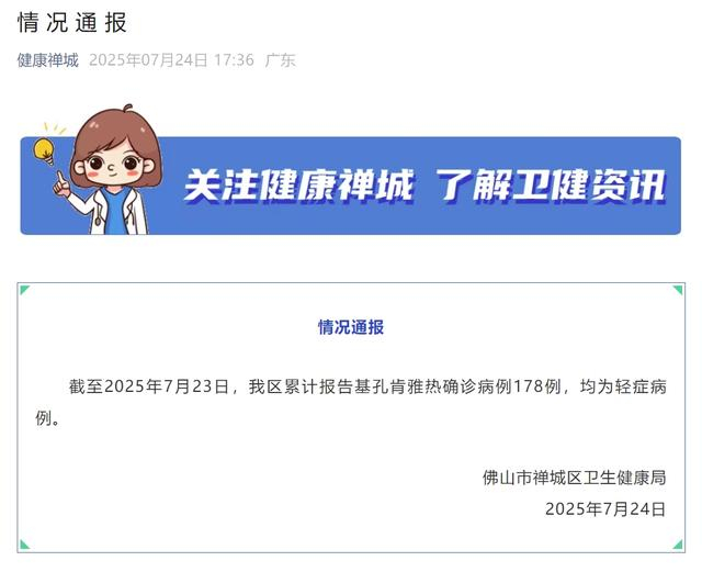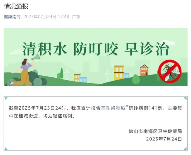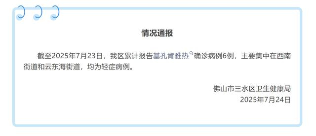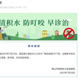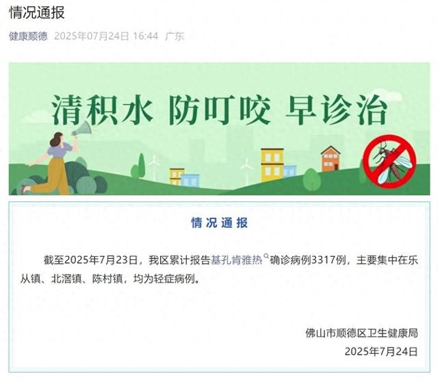 根据佛山五区卫生健康局发布的情况通报,截至2025年7月23日,佛山全市已累计报告3645例基孔肯雅热确诊病例,均为轻症病例。