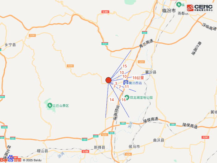 周边县城:震中距襄汾县16公里、距新绛县26公里、距侯马市27公里、距曲沃县30公里、距尧都区38公里,距临汾市35公里,距太原市248公里。