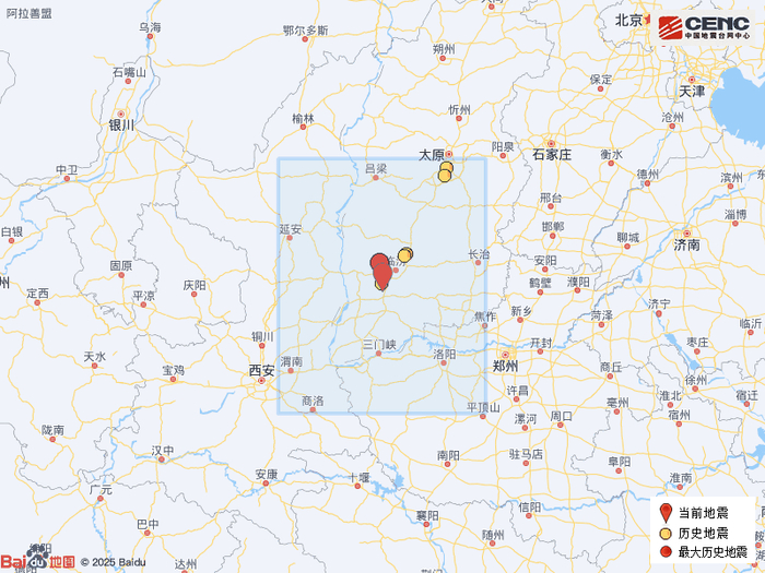 历史地震:根据中国地震台网速报目录,震中周边200公里内近5年来发生3级以上地震共6次,最大地震是2025年1月10日在山西临汾市尧都区发生的4.1级地震(距离本次震中35公里),历史地震分布如图。