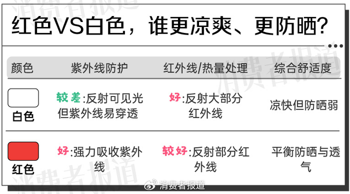 业内人士向《消费者报道》记者透露,当阳光照射在红色衣物上时,面料会吸收大量紫外线,同时反射产生热辐射的红外线,这样既减少了热量向人体传递,又能起到防晒作用。相比之下,白色等浅色系衣物虽能反射红外线等可见光,但紫外线容易穿透,长时间暴露在阳光下容易晒伤。