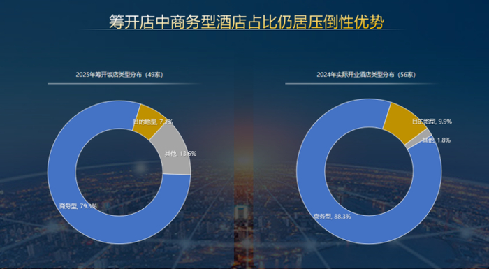 据统计,商务酒店在筹建及开业的酒店数量占比仍居于压倒性优势。2024年商务型酒店在开业酒店占比高到88.3%,预计2025年仍然可达79.3%。但是“政务市场极度萎缩、商务需求难以恢复”这一行业状况仍将持续。