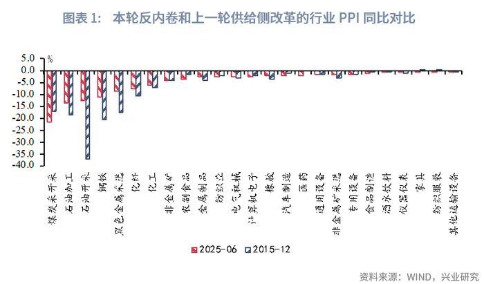 和上一轮供给侧改革时的PPI变化特征相比,当前PPI下跌的行业更具普遍性。可见本轮反内卷和上一轮供给侧改革时期影响PPI的主导因素或有不同。