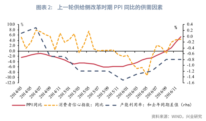 从上一轮供给侧改革时期PPI同比的供需因素来看,PPI同比变化和产能利用率变化趋势相关性较高,PPI跌幅扩大的过程也伴随着产能利用率的下降,且PPI回升的时点也对应着产能利用率回升的时点。而在PPI跌幅扩大的前期,消费者信心指数仍然保持着正增长。以上证据或表明,上一轮供给侧改革过程中供给因素在PPI变化中起到更为关键的作用。