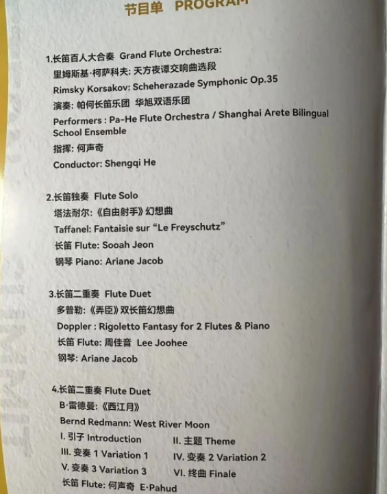 根据观众肖女士提供的节目单,这三首曲目分别是长笛百人合奏、长笛独奏、长笛二重奏。肖女士表示,这三首加塞曲目给了她极为糟糕的体验