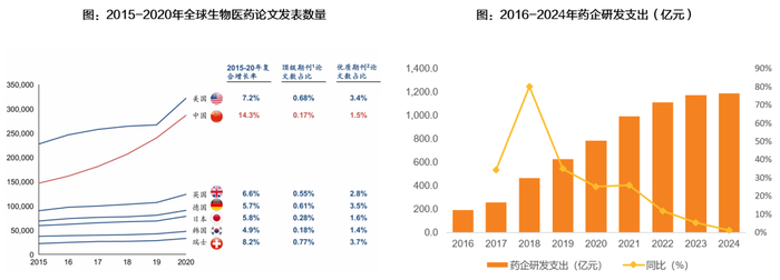 4、研发持续发力,带动创新药蓬勃增长。基础研究持续发力。从发表论文数量看,中国生物科学及医学相关论文产出快速提升,已经成为仅此于美国的第二大生物科学及医学论文产出国:2015-2020年中国生物医学领域论文发表数量以14.3%的年均复合增长率快速攀升,2020年发表量达近29万篇。研发费用持续增长。Wind数据显示,生物医药企业(A+H,包括传统制药及创新药企业)2016年整体研发费用为192亿元,2024年已经增长至1190.4亿元,CAGR达29.8%。持续的研发投入为创新药提供坚实的基础。