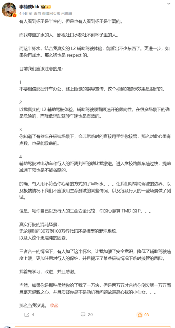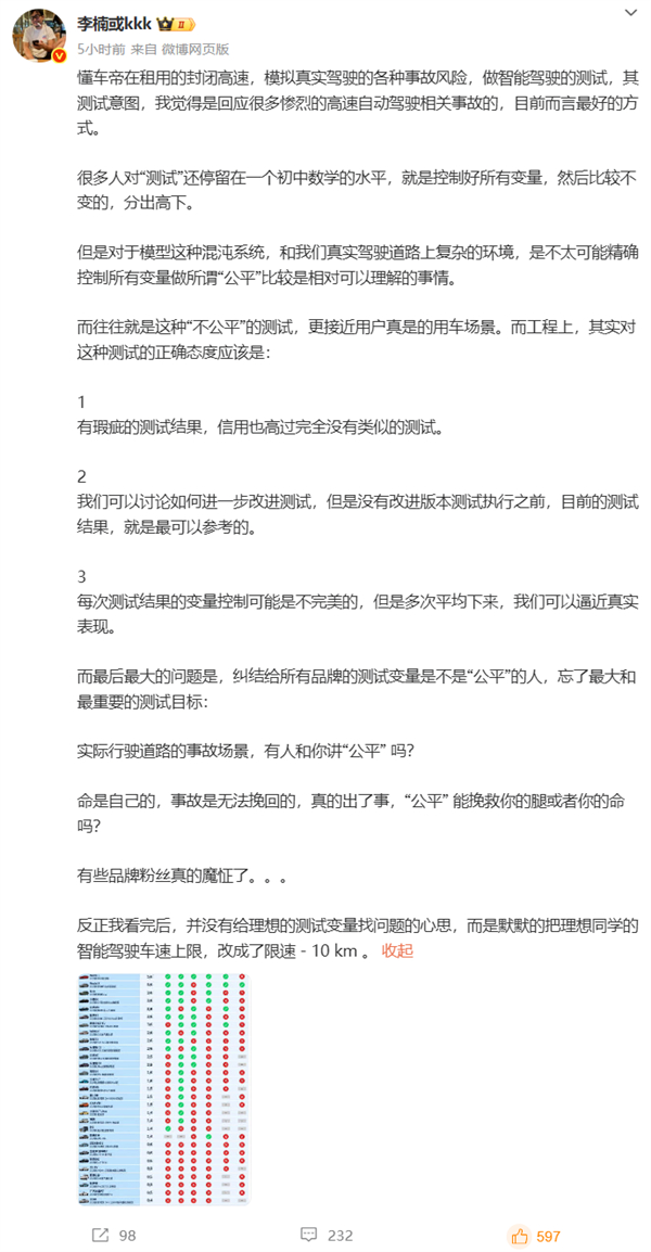 怒喵科技创始人李楠也发文,分享了他对懂车帝测试及辅助驾驶的看法。李楠表示,很多人对“测试”还停留在一个初中数学的水平,即控制好所有变量,然后比较不变的,分出高下。他认为,有瑕疵的测试结果信用也高过完全没有类似的测试,可以讨论如何进一步改进测试,但是没有改进版本测试执行之前,目前的测试结果就是最可以参考的。