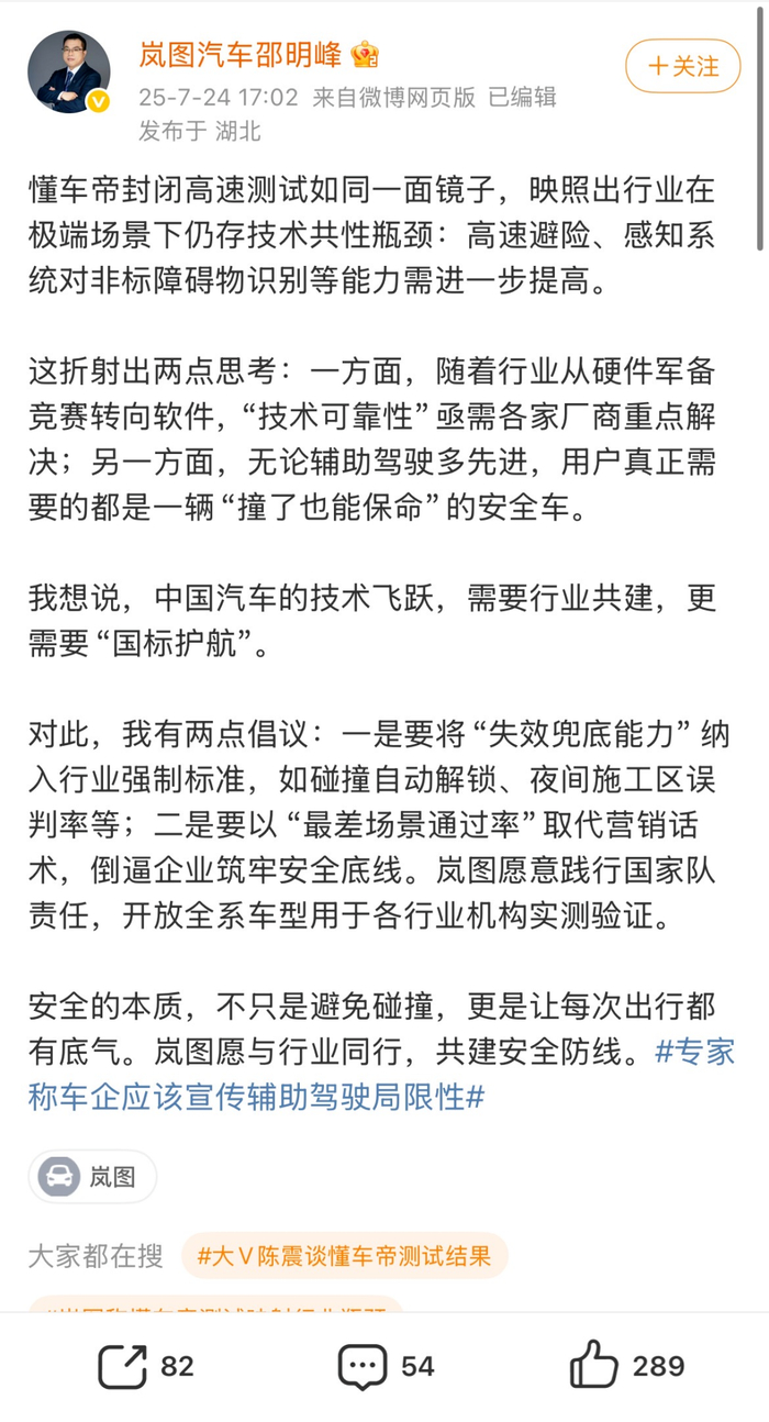 岚图汽车 CBO、销售公司总经理邵明峰发文称:“懂车帝封闭高速测试如同一面镜子,映照出行业在极端场景下仍存技术共性瓶颈:高速避险、感知系统对非标障碍物识别等能力需进一步提高。”