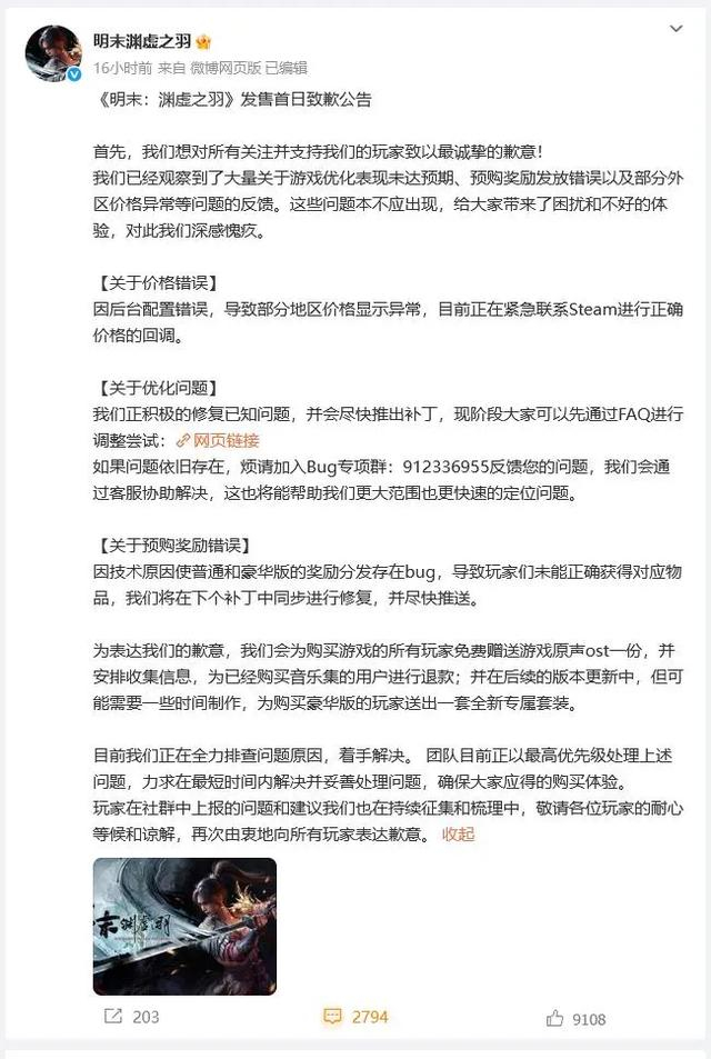 对此,《明末》正式发售9个小时后,官方发文道歉,并回应相关问题,给出了解决方案。