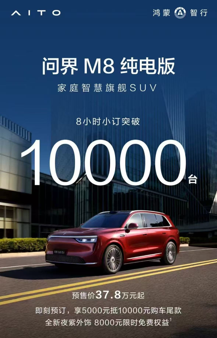 据鸿蒙智行消息,问界M8纯电版8小时小订突破1万台。