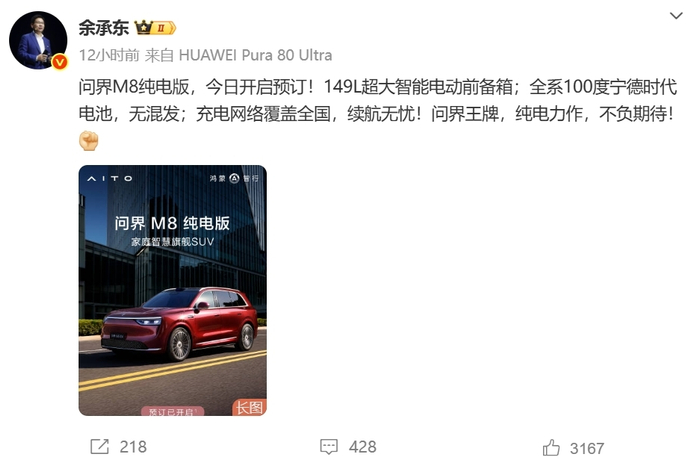 当天,华为常务董事、终端BG董事长余承东发文称,问界M8纯电版,今日开启预订!149L超大智能电动前备箱;全系100度宁德时代电池,无混发;充电网络覆盖全国,续航无忧。