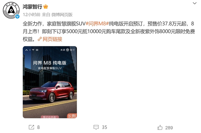 7月25日,问界M8纯电版开启预订,预售价37.8万元起。