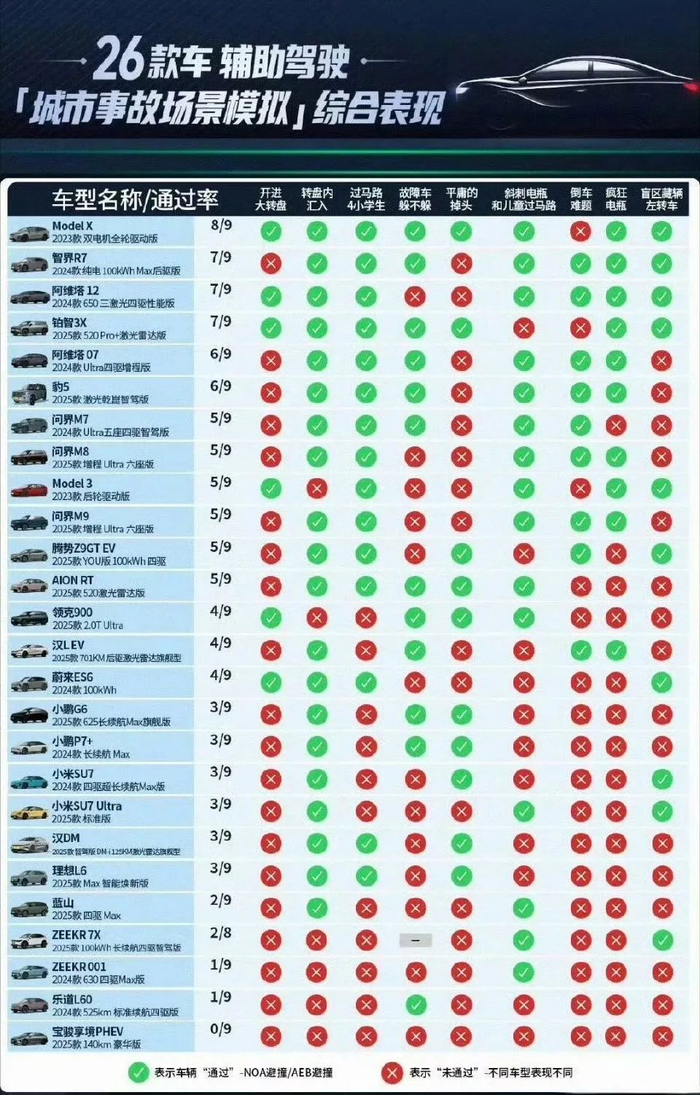 懂车帝目前公布了36款车高速事故场景与26款车城市场景的测试结果,高速事故场景结果显示:2023款特斯拉Model3后轮驱动版与ModelX双电机全轮驱动版排名榜单第一第二位置,仅一项未通过。其中,Model3在“莽撞横穿的猪”一项未通过、Model X则在“高速临时施工一项未通过”。排名在后的为蓝山、小鹏G6、问界M9、智界R7,腾势Z9GT EV这些车型的通过率为3/6,有3项显示未通过。还有很多车型通过率均低至1/6,甚至有的车一项都没有通过。
