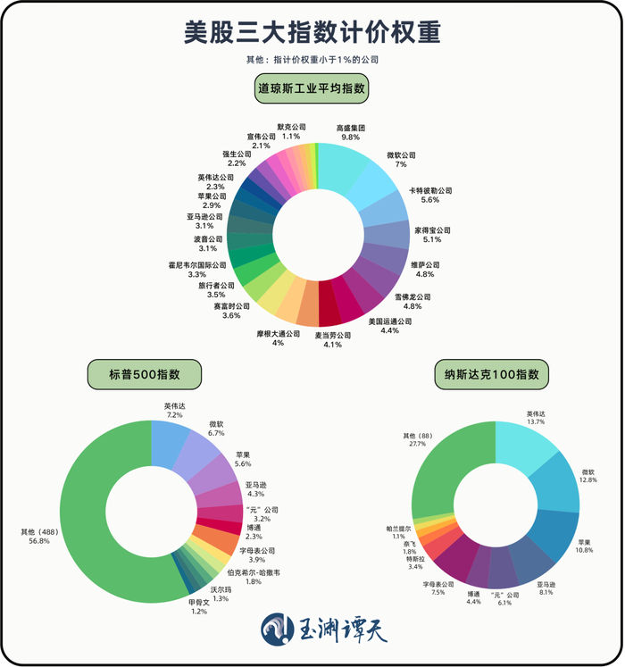 标普500和纳斯达克采用“市值加权”,权重最大的是那几个科技巨头;而道指用的是“股价加权”,高价股走强,也能拉动整体指数。
