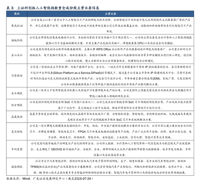 指数市值分布结构性特征明显,龙头与中小市值企业并重。根据Wind,截至2025年7月24日,科创人工智能指数成份股自由流通市值合计5451亿元。龙头个股权重较高,为指数提供一定稳定性;中小市值个股数量多、权重较低,贡献成长空间,兼顾风险分散与高弹性投资机会,契合人工智能产业链技术迭代快、细分赛道多元的特性。