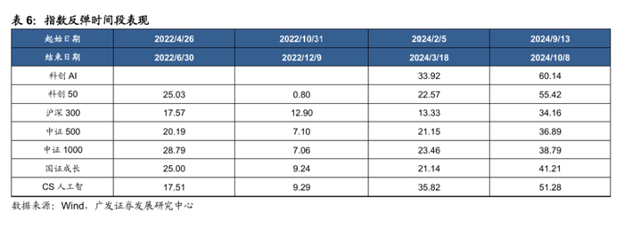 受成份股的板块影响,由于科创板成份股的日度涨跌幅限制更宽,科创板相关指数在暴涨/反弹环境下较为独特。我们定义2022年以来的几次反弹环境,分别包括 2022.04、2022.10、2024.02、2024.09几次反弹时段,来观测反弹期下的指数表现。2024年内市场反弹环境下,科创板人工智能指数表现突出。2024 年以来,新质生产力受到高度关注,以人工智能为首的部分指数表现出的突出的反弹表现,与可比指数相比,科创板人工智能指数的反弹力度相对占优。
